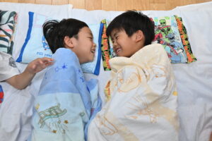 年長組ならではの行事「お泊り保育」がありました。子どもたちが切った野菜の入ったカレーを食べて、宝探しをしたり、映画や花火をみたりと盛りだくさんの一日でした。そして、布団を敷いてみんなで「おやすみなさい💤」