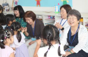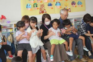 「敬老の日」にちなんで、おじいちゃん、おばあちゃんに幼稚園に来ていただき、一緒に遊んだりプレゼントを渡したり・・・と楽しい時間を過ごしました。