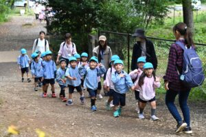 年中組と年長組はこども動物園を見た後にピクニック広場へ行って、どんぐり拾いや遊具であそびました。