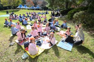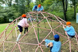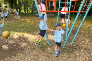 動物を見た後にシートを敷いてお弁当をみんなで食べました。年長さんはおもしろそうな遊具を見つけるとすぐに挑戦!