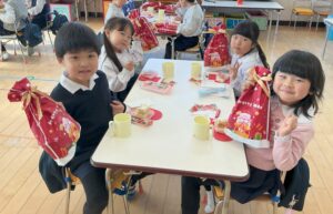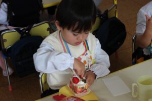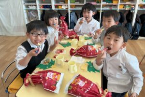 クリスマス会では、映画やパネルシアター、ブラックシアターを観て、ケーキを食べました。